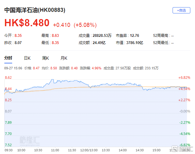 而或受這一消息面影響,疊加國際油價連日攀升,中海油在港股拉昇明顯,收漲5.08%,最新市值爲3786億港元。