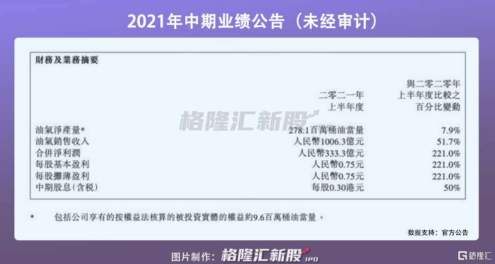 回顧2021年上半年業績 ,受益於油價回升,疊加克服大宗商品漲價等因素,中海油表現較爲亮眼。報告期內實現營業收入1102.33億元,同比增47.8%,公司實現淨利潤333.3億元,同比增長221%,每股基本盈利人民幣0.75元,中期股息(含稅)每股0.30港元。