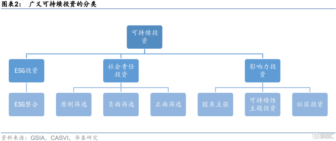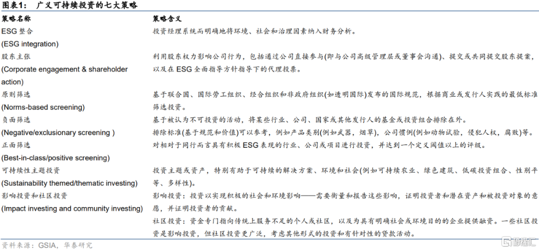 為進一步釐清可持續投資的概念,我們引入全球可持續投資聯盟(GSIA)定義的廣義可持續投資的七大投資策略:ESG整合、股東主張、原則篩選、負面篩選、正面篩選、可持續性主題投資和社區投資,如下表所示。根據不同策略的具體含義以及歷史演變,本文參考社會價值投資聯盟(CASVI)的方法,將其七大策略進行分類:三種篩選策略本質上均屬於“篩選與排除”的社會責任投資;可持續性主題投資、社區投資和股東主張策略對解決環境、社會問題的主動性更強,歸為影響力投資;並嚴格定義只有使用ESG整合策略(在傳統財務和估值分析的基礎上同時考慮E/S/G三個因素)的投資屬於ESG投資。