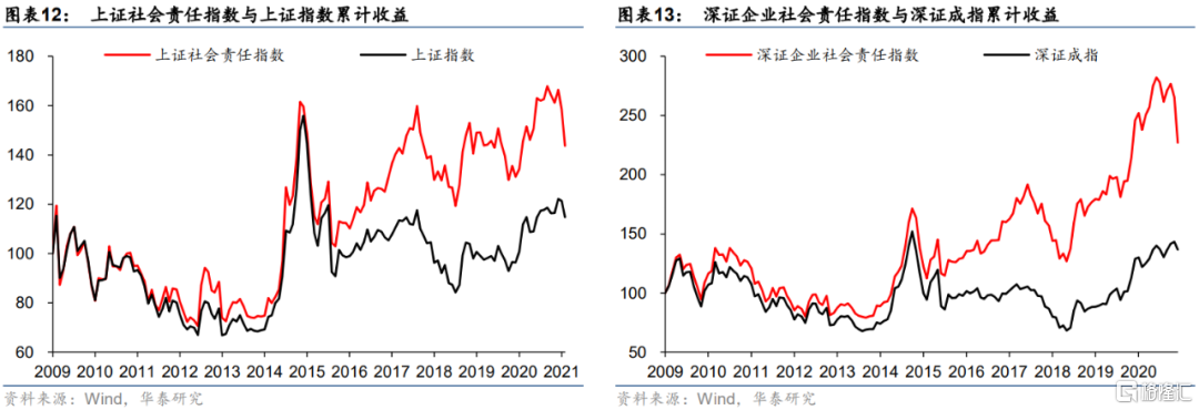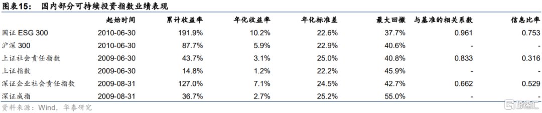 中國市場上的可持續投資的業績綜合表現會相對於比較基準展現出更加明顯的優勢。首先看收益方面,國證ESG 300指數從2010年6月以來取得高達10.2%的年化收益率,是基準滬深300年化收益率5.9%的近兩倍。與此同時,上證社會責任指數(3.1%)和深證企業社會責任指數(7.1%)的年化收益也都大幅領先於基準。接着看風險方面,除了上證社會責任指數的收益率年化標準差(86.7%)大於基準指數,國證ESG 300指數(22.6%)和深證企業社會責任指數(24.5%)的年化標準差均小於基準。同時,三個指數的最大回撤幅度均小於基準指數。然後看相關係數,發現不同編制標準下的可持續投資指數與基準的相關性呈現出較大差異,相關性最高的為國證ESG 300,與滬深300的相關性高達0.961,相關性最低的為深證企業社會責任指數與深證成指,僅為0.662。最後看相對風險收益比,國證ESG 300的信息比率達0.753,相對於基準表現出了優異的經風險調整收益表現。