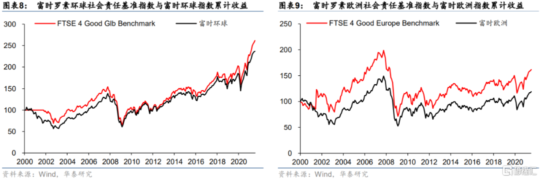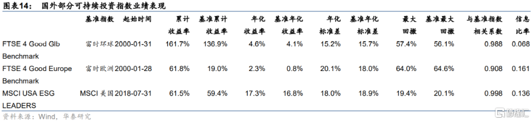 歐洲市場上,收益方面,可持續投資指數的年化收益(2.3%)是基準指數的約4倍;但是風險略高於基準,收益率年化標準差為20.1%;信息比率為0.161。美國市場上,2018年7月以來,受益於大盤上漲行情,可持續投資指數年化收益率高達17.3%;風險方面,可持續投資指數的年化標準差和最大回撤均小於基準指數;信息比率為0.136。