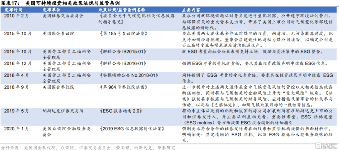 從美國可持續性投資的推進節奏分析,2010年發佈的《委員會關於氣候變化相關信息披露的指導意見》,開啟了美國上市公司對氣候變化等環境信息披露的新時代。2015年,在聯合國提出可持續發展目標(SDGs)後,美國也相應地在政策法規中做出了迴應,首次頒發了基於完整ESG考量的規定——《解釋公吿IB2015-01》。往後美國加速了ESG政策法規的制定和出台,ESG政策法規的發展步入了快車道。