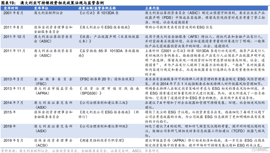多主管部門共同推進ESG政策法規體系構建。澳大利亞審慎監管局(APRA)、澳大利亞證券交易所(ASX)、金融服務委員會(FSC)是推進澳大利亞可持續金融建設的主要部門,此外澳大利亞退休金投資者理事會(ACSI)也在背後起了極大推動作用。
