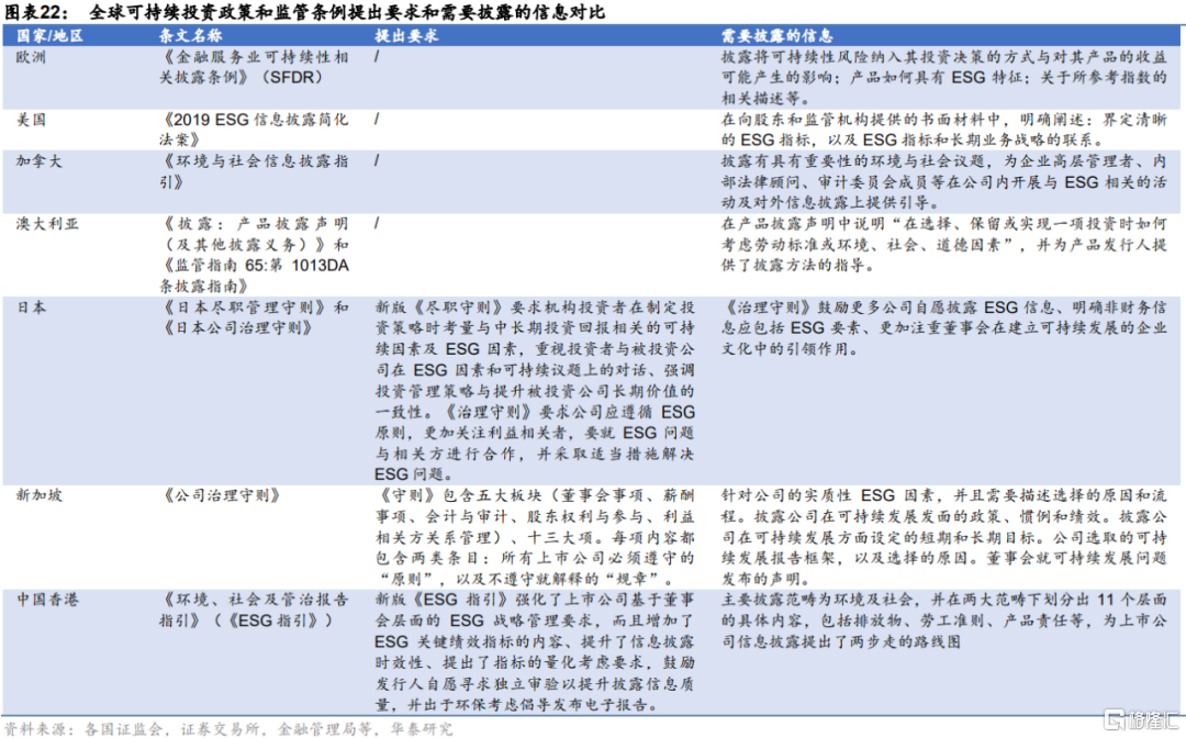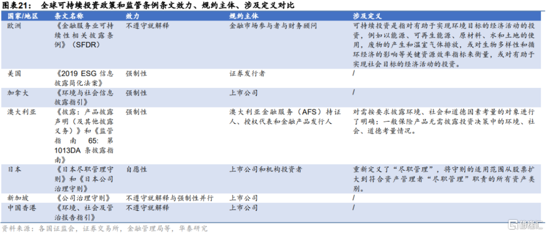 歐洲《金融服務業可持續性相關披露條例》(SFDR)對使用可持續投資的金融產品的披露進行了相關的規定,實行不披露就解釋的原則。美國的《2019 ESG信息披露簡化法案》與歐盟ESG相關政策法規的強制力方面相比,對於信息披露的要求不存在“不遵守就解釋”的空間,相對更加嚴格。澳大利亞關於可持續投資的條例體現出強制性較高的特點。在亞洲,日本兩大主要守則《日本盡職管理守則》和《日本公司治理守則》均採用原則性倡議,以自願參與和遵守為主;新加坡最新版的《公司治理守則》包含所有上市公司必須遵守的“原則”,以及不遵守就解釋的“規章”;香港的相關條例強制性要求趨嚴,對《環境、社會及管治報吿指引》多次修訂完善,將環境及社會範疇“一般披露”的內容效力提升至“不遵守就解釋”。