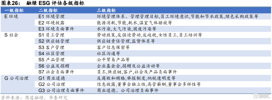 融綠ESG信息評估體系共包含三級指標體系。一級指標為環境、社會和公司治理三個維度。二級指標為環境、社會和公司治理下的13項分類議題,如環境下的二級指標包括環境目標、環境管理、環境披露及負面事件等。三級指標將會涵蓋具體的ESG指標,共有127項三級指標,例如社會方面的三級指標包括勞工政策、員工政策、女性員工、多樣化、供應鏈責任管理等30多項指標。評估體系分為通用指標和行業特定指標。通用指標適用於所有上市公司,行業特定指標是指各行業特有的指標,只適用於本行業分類內的公司。