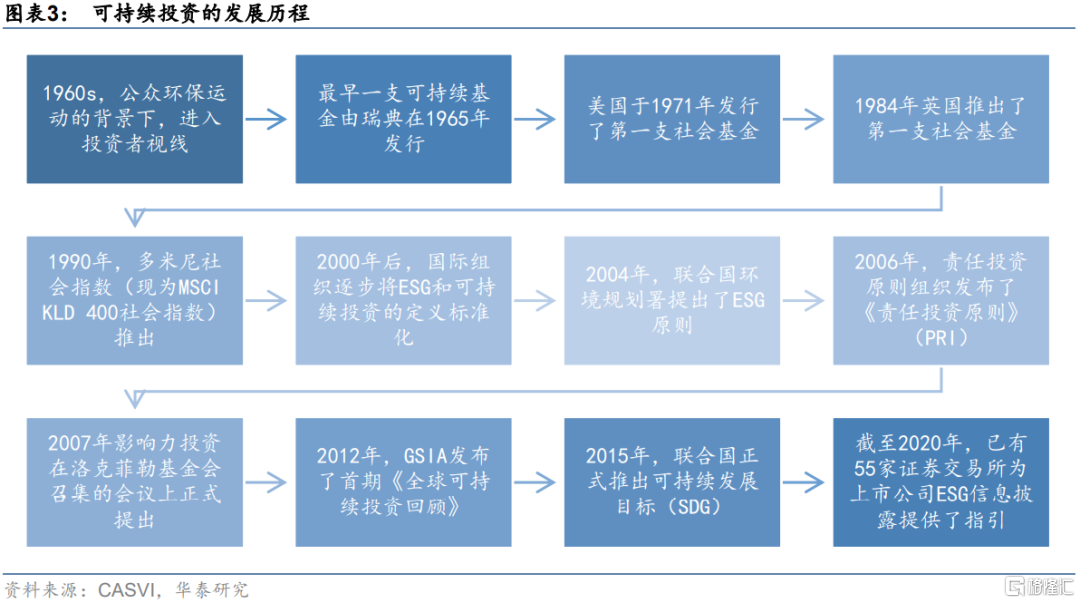ESG理念的形成和推廣為可持續投資發展注入活力。2004年,聯合國環境規劃署系統整合了市場上常見的對環境議題,社會議題和公司治理的關注,正式提出了ESG原則。2006年,聯合國支持的責任投資原則組織發佈了《責任投資原則》(Principles for Responsible Investment,PRI),該原則致力於推動各大投資機構在決策過程中納入ESG原則,幫助PRI的簽署方提升可持續投資水平。2007年影響力投資在洛克菲勒基金會召集的會議上正式提出,與會人士正是早期影響力投資者,他們希望通過投資綠色科技、微型金融等項目積極創造投資附加值。2012年,GSIA發佈了首期《全球可持續投資回顧》。2015年,聯合國正式推出可持續發展目標(SDG)。截至2020年, 已有55家證券交易所為上市公司ESG信息披露提供了指引。