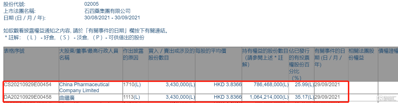 石四藥集團(02005.HK)獲主席兼行政總裁曲繼廣增持343萬股