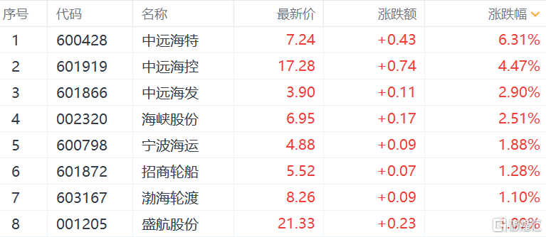 今日航運股集體走強,A股中遠海特漲超6%,中遠海控漲超4%;港股中遠海控漲近6%,太平洋海運漲超4%,中遠海發漲超3%。