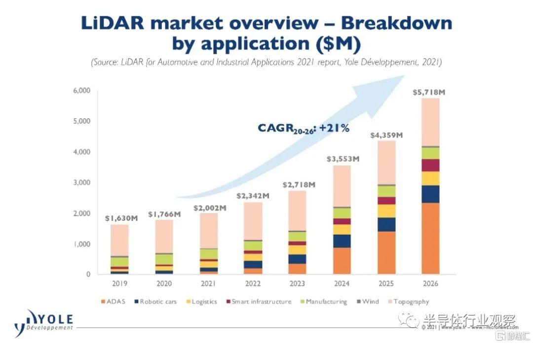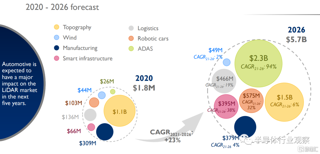 Yole市場分析師Alexis Debray表示:“2020年激光雷達在ADAS中的應用佔汽車和工業激光雷達市場的1.5%。預計到2026年這一比例將達到41%,市場規模將達到23億美元,同期CAGR高達111%。”
