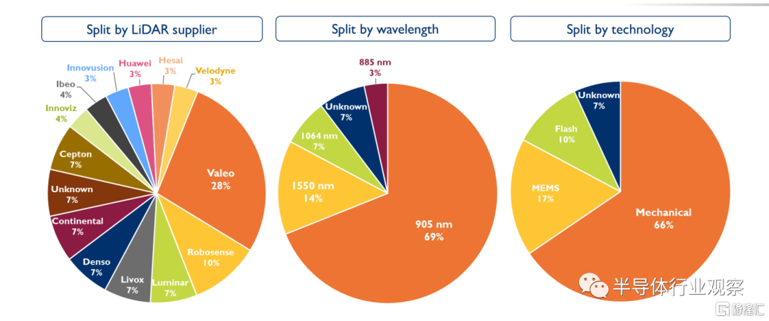 技術選擇和供應鏈管理是激光雷達發展的關鍵因素。Yole發佈的《2021年用於汽車和工業應用的激光雷達》報吿中對已經落地的29個項目中的激光雷達供應商、市場份額、波長分類以及技術分類進行了彙總。