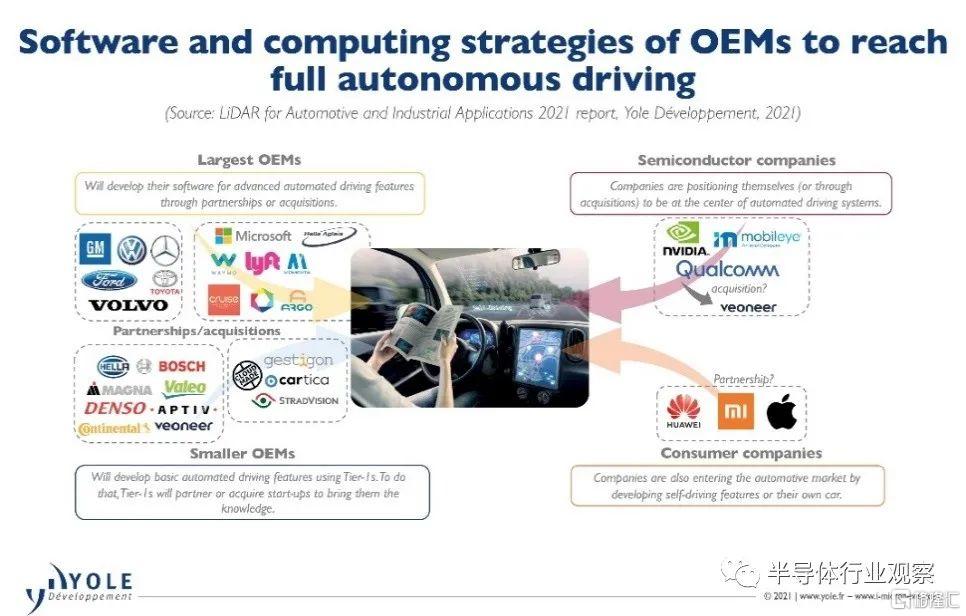 此外,自動駕駛的發展自然也會吸引主機廠和Tier1供應商的關注,其他來自半導體或消費領域的企業也將加入競爭。在這場完全自主的競賽中,擁有大量資源或雄厚資金的大型企業將對相關公司進行收購或合作。包括主機廠、頭部Tier1廠商以及高通、英偉達或英特爾等半導體公司正在通過收購提升自身產品佈局和競爭力,將自己定位於自動駕駛系統的中心。