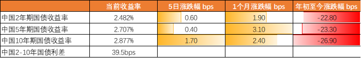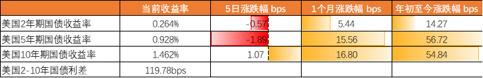 本週美國2年期國債收益率周降0.57bp,5年期收益率按周降1.89bps,10年期收益率按周升1.07bps,2-10年的利差爲119.78s,利差較上週走闊。