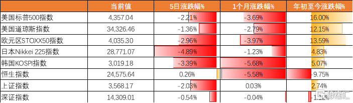 上週全球股市表現較差,標普500指數5日跌-2.21%,道瓊斯指數跌-1.36%,歐元區STOXX50指數跌-2.96%,日經指數跌-4.89%,恆生指數漲0.26%,上證、深證指數分別跌-2.03%、跌-0.54%。
