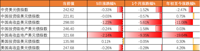 上上週全球債市表現同樣較差,中資美元債指數5日跌-0.33%,投資級和高收益分別跌-0.03%和跌-1.23%,中國投資級和高收益地產美元債指數分別跌-0.24%和跌-2.14%,美國投資級和高收益分別漲0.11%和跌-0.26%。