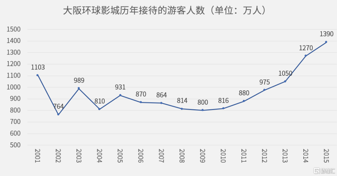 日本大阪的環球影城2001年開業當年,遊客人數達到1103萬人次。新鮮勁過去之後的十年,遊客人數基本維持在800萬人次。