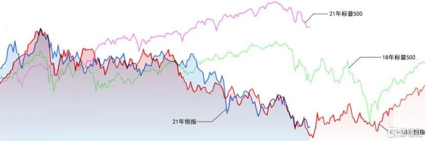 紅色線是18年的恆生指數,綠色線是18年的標普500,藍色線是21年的恆生指數,紫色線是21年的標普500。