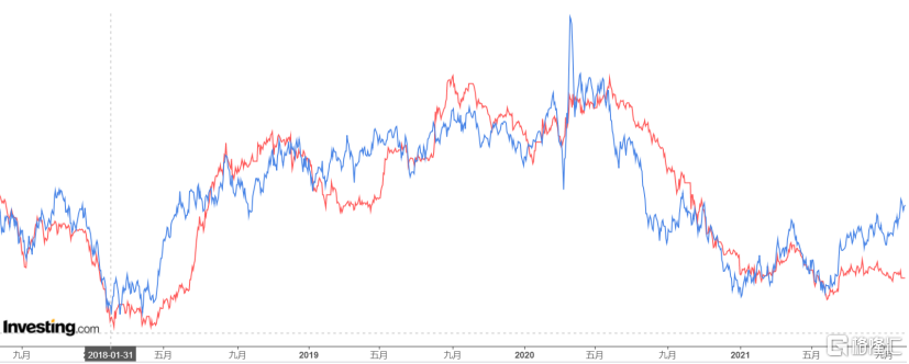 藍色線是美元指數,紅色線是美元人民幣匯率。