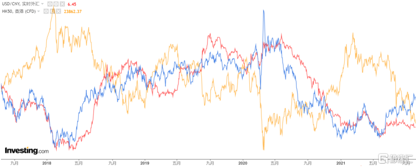 把恆指放到這張圖裏,藍色是美元指數,紅色是人民幣匯率,黃色是恆生指數。
