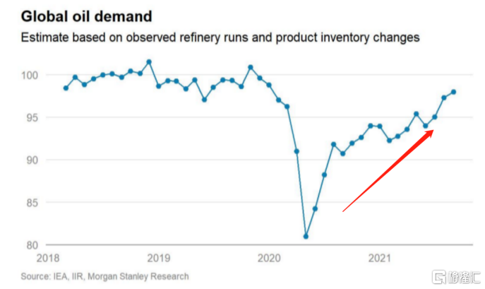 摩根士丹利運用煉油廠運行的數據和產品庫存變化的數據對全球石油需求的變化進行了估算,發現近期的需求量顯著提高,基本上恢復到疫情前的水平。