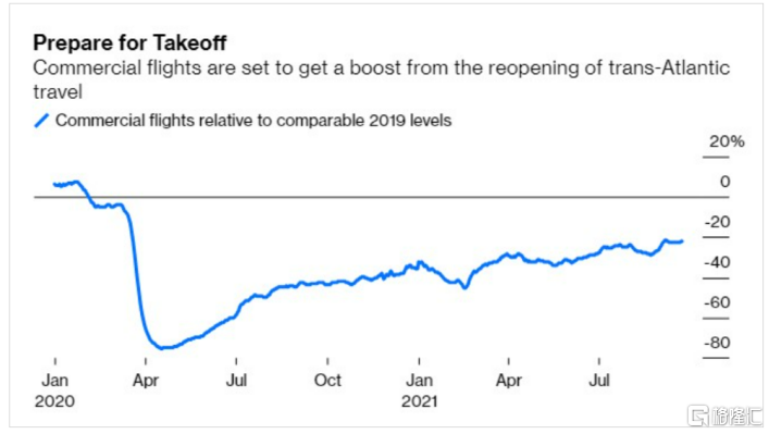 此前,雖然陸運及港口運輸的燃料需求已經恢復並超出封鎖前的水平,但是長途航空旅行的石油需求一直沒有得到有效的恢復。根據相關機構的報道,跨大西洋的商業航班仍比2019年低20%以上。