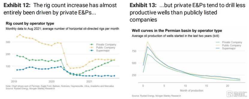 根據摩根斯坦利的統計,近幾個月以來,美國鑽井平臺數量雖然有所回升,但基本都是由私營公司推動的,大型的、上市石油勘探公司的鑽井數量已經大半年沒有增加了。而私營公司的產量相比於其他兩個更少,這就使得美國整體產量恢復的速度偏慢,石油供需缺口還會持續一段時間。