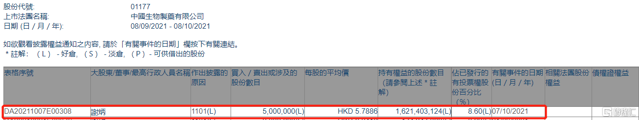 格隆匯APP獲悉,根據聯交所最新權益披露資料顯示,2021年10月7日,中國生物製藥(01177.HK)獲執行董事謝炳在場內以每股均價5.7886港元增持500萬股,涉資約2894.3萬港元。