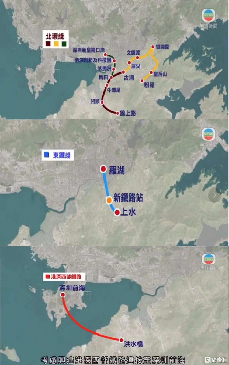 3、增設4條連通深圳的鐵路,北環線由新田站至深圳新皇崗口岸;北環線由古洞站至文錦渡再到粉嶺;東鐵線延伸過境至羅湖建新站;港深西部鐵路由洪水橋連接至深圳前海。
