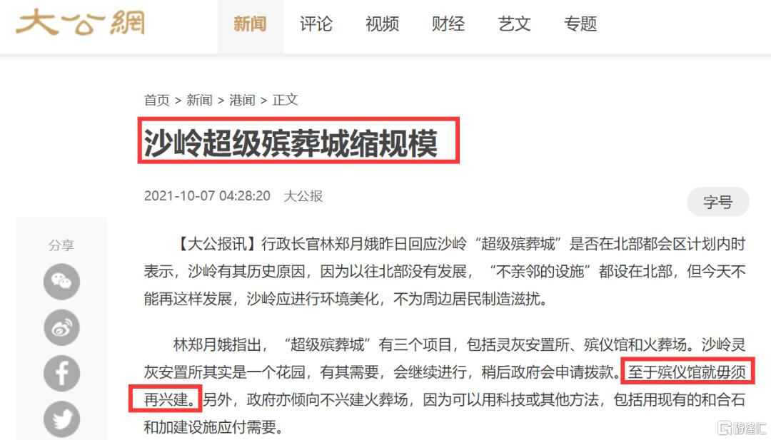 但昨天香港行政長官迴應沙嶺“超級殯葬城”計劃,表示殯儀館以及火葬場不用再興建。