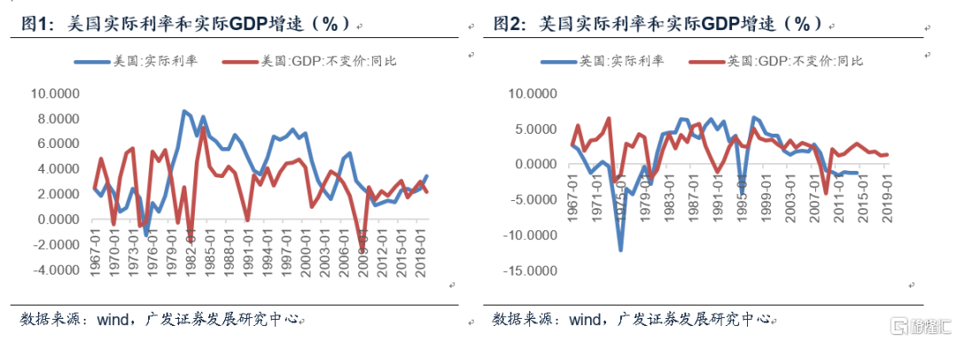海外我們仍以上文所舉的美英爲例,兩國都是在70-80年代完成的利率市場化改革。從圖1-2來看,兩國在利率市場化改革前,實際利率基本都在實際經濟增速下方運行,利率被多重因素壓低;但在利率市場化改革後,實際利率水平的定價變得市場化,實際利率或高於實際經濟增速,或圍繞實際經濟增速波動,不再明顯低於實際經濟增速。