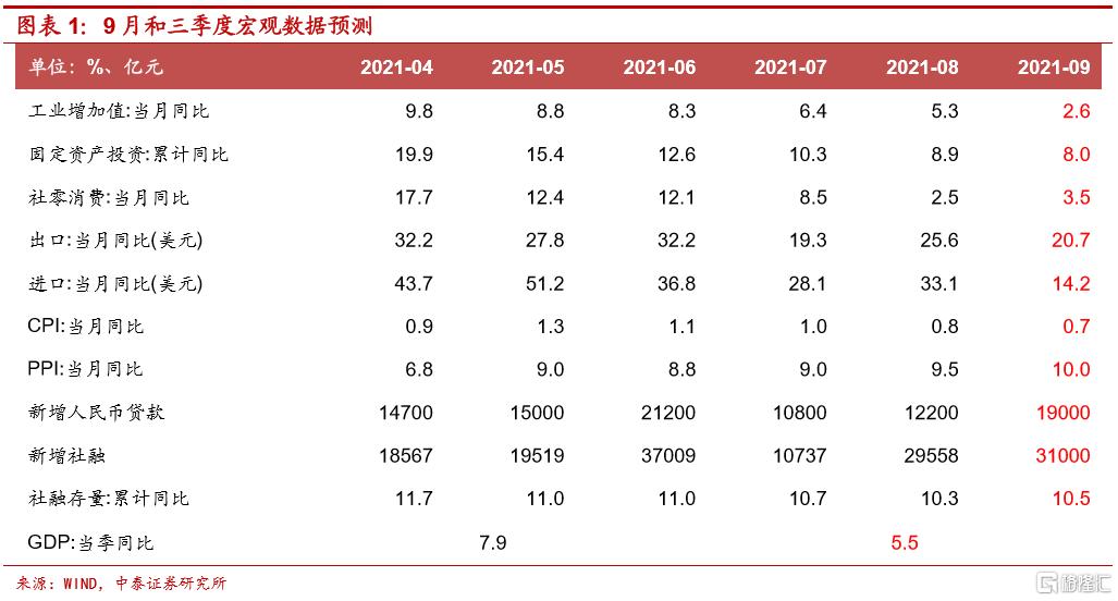 本週(10.11-10.17)將陸續公佈9月份主要宏觀數據和三季度GDP數據。市場關注點預計集中在幾個方面:受能耗雙控政策和電煤供應缺口影響,9月多省市採取較嚴厲的雙限政策,對於工業生產和物價影響有多大?內外需持續分化背景下,投資和消費能否進一步修復?8月下旬金融機構貨幣信貸形勢分析座談會召開以來,央行多次釋放“穩信用”的政策信號,9月社融增速能否止跌反彈?本週週報我們基於指標趨勢的判斷,結合高頻數據和政策的邊際變化,對9月份各項數據進行前瞻,供投資者參考。