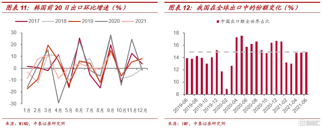 “替代效應”下降空間有限。由於東南亞疫情緩和,越南、韓國等國出口環比增速由負轉正。9月越南出口環比增長3.05%(前值-2.96%),韓國前20日出口環比增長11.97%(前值-0.97%),但韓國9月環比增速慢於季節性,顯示其出口仍未完全恢復,我國出口短期內仍受到“替代效應”支撐。從長期來看,隨着海外生產進一步恢復,替代效應或將邊際減緩。但今年6月數據顯示,我國在全球出口中的份額已經降至14.9%,僅略高於疫情前水平,出口份額下降空間已經較爲有限,不會對出口造成明顯拖累。