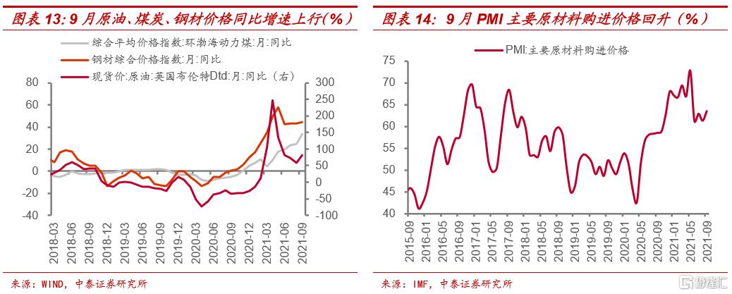 9月PPI同比讀數預計繼續衝高,達到兩位數。從高頻數據看,9月主要大宗商品價格同比增速顯著上升。颶風艾達摧毀美國墨西哥灣一處設施,導致美國原油生產受到衝擊,截至9月末美國原油產量仍未恢復颶風前水平(減少20萬桶/天)。供給短缺疊加歐洲能源危機提振原油需求,9月布倫特原油均價74.57美元/桶,同比增速高達82.55%(8月爲57.7%)。受進口煤市場偏緊,以及汛情導致水力發電同比負增影響,煤炭價格持續高漲,9月環渤海動力煤綜合平均價格指數729.6元/噸,同比增長33.38%(8月爲24.94%)。鋼材方面,據Mysteel統計,9月全國超80家鋼鐵企業存在停產檢修情況,供給端減量帶動鋼材價格進一步上漲,9月鋼材綜合價格指數均值153.94點,同比增長44.29%(8月爲43.49%)。領先指標同樣印證9月原材料價格上漲趨勢。9月PMI主要原材料購進價格分項回升2.2個百分點至63.5%,推測9月PPI同比增速較8月進一步走高。