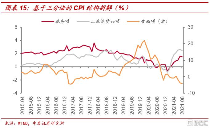 物價:PPI-CPI剪刀差擴大。9月煤炭、原油、鋼鐵等原材料價格同比漲幅走闊,PMI主要原材料購進價格分項高於6-8月數值,預計9月PPI同比增速達到10.0%。從三分法視角看,預計食品價格延續同比負增,工業消費品價格小幅上升,服務價格進一步回升,預計9月CPI同比增速約0.7%。
