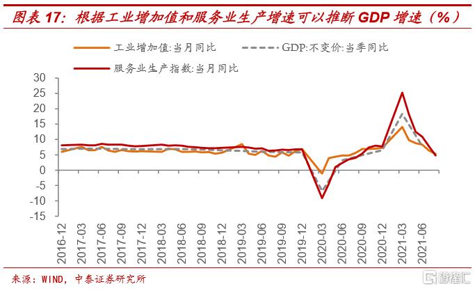 受疫情波動和“雙限”政策的衝擊影響,三季度各月之間生產和需求指標波動較大,給GDP增速預測帶來較大困難。我們嘗試使用一種粗略的定量方法進行估算,考慮到第一產業佔比較小,生產法統計的GDP主要受第二、三產業增速變動的影響。因此我們可以使用工業生產增速和服務業生產指數增速來擬合GDP季度同比增速,從2017年以來的季度頻率數據樣本看,擬合度超過95%。參考我們對於9月份工業生產和服務業增速的預測假設,可以分別計算出兩個指標三季度的平均增速,從而擬合出三季度GDP增速,約爲5.5%。