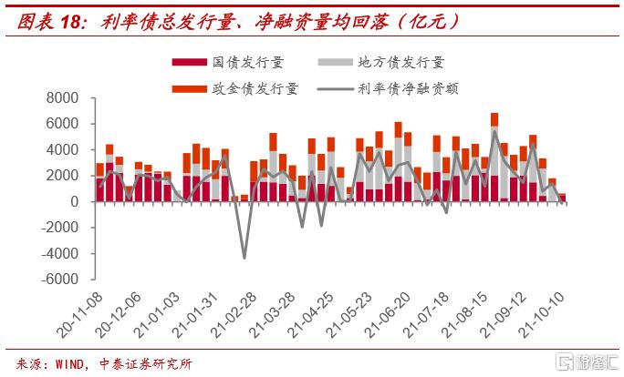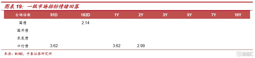 受國慶假期影響,一級供給回落。本週利率債總計發行640億元,其中國債500億元,政金債140億元,無地方債發行,本週淨融資量爲-129.85億元,較上週減少1553億元。下週利率債總發行量預計回升至2345億元。一級市場招標情緒弱於節前,182D國債,1Y、2Y口行債全場倍數均小幅下降。