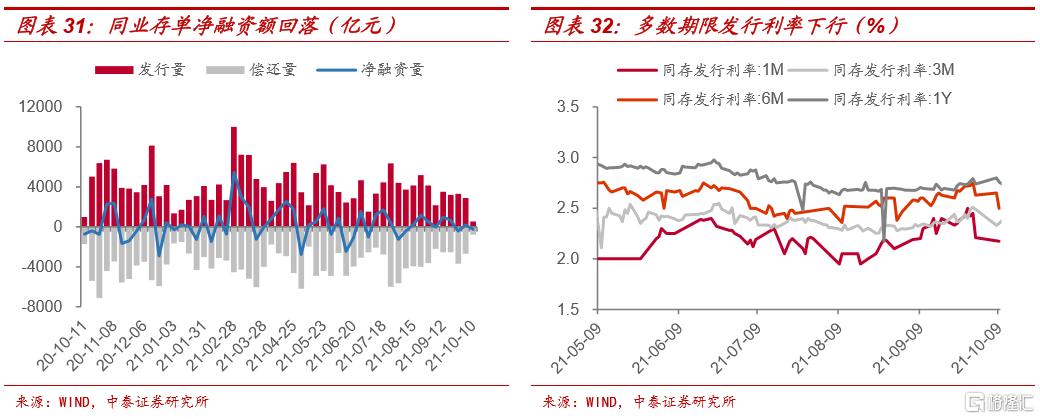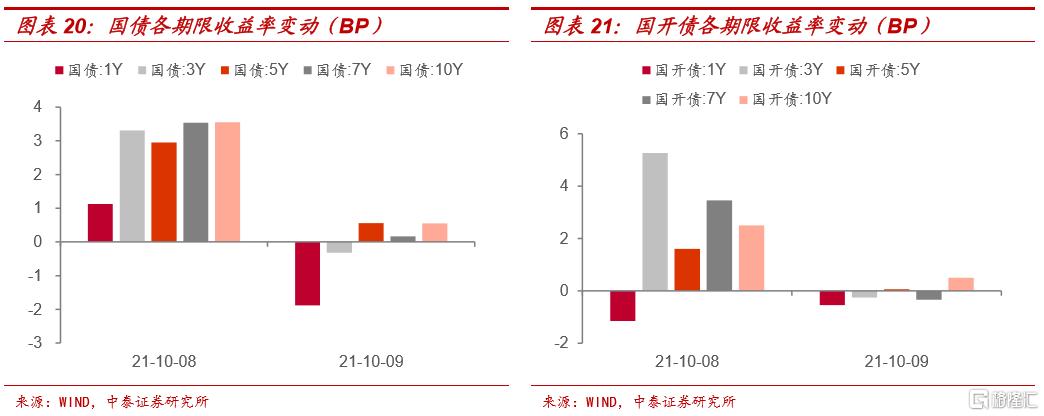 國債、國開債收益率曲線均陡峭化。週五,受國慶假期海外債市收益率普遍上行影響,國內債市承壓低開,加之央行在跨季跨節之後大額回籠流動性,全天債市走勢低迷。週六,期市休市,現券走勢寡淡。從全周看,國債和國開債中,除1Y收益率出現下跌,其餘各期限收益率均上漲。國債、國開債期限利差本週均走闊。