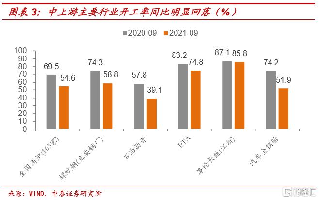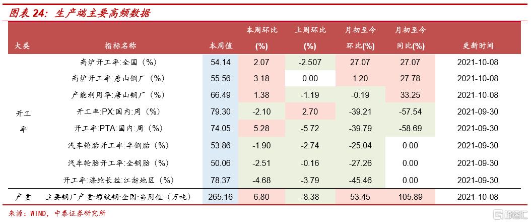 鋼廠生產方面,全國高爐開工率爲54.14%,較上週上升2.07個百分點。唐山高爐開工率爲55.56%,上升3.18個百分點,產能利用率提升1.38個百分點至66.49%,體現出“糾正地方‘一刀切’停產限產、‘運動式’減碳”效果顯現。化工方面,據9月30日數據顯示,PX開工率79.30%,較上週回落2.10個百分點。PTA開工率回升5.28個百分點至74.05%。本週汽車輪胎開工率下降,全鋼胎、半鋼胎開工率分別爲50.06%、53.86%,較上週下降2.51、1.90個百分點。受節前鋼企集中限產、減產的影響,螺紋鋼產量下滑,節後螺紋鋼產量周環比回彈6.80個百分點達265.16萬噸。雙控政策下,本週滌綸長絲廠家開工負荷進一步下降,開工率下降4.68個百分點至78.37%。