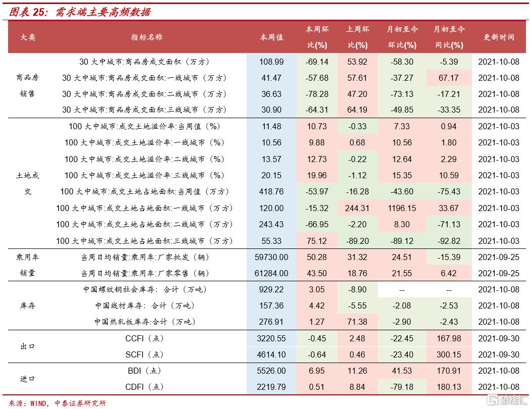 商品房銷售方面,本週30大中城市商品房成交面積大幅回落69.14%至108.99萬方。具體來看,二線城市商品房成交面積持續領跌,環比大幅下降78.28%。一、三線城市的商品房成交面積分別環比下降57.68%、64.31%,降幅較上週進一步擴大。一方面,針對房地產限購、土地溢價率等方面政策陸續出臺影響購房者的情緒;另一方面,國慶期間大多數購房者選擇假期出遊,導致樓市活躍度降低。土地成交方面,本週100大中城市的土地成交規模轉跌,總成交規模下降至418.76萬方,降幅高達53.97%。主要受到二輪集中供地規則調整影響,多地通過加強競買人資質、購地資金來源管理,提高競拍門檻,整體拿地情緒趨於理性冷靜,一二線城市土拍量價均延續低位運行。各能級城市方面,一二線城市成交規模降幅分別達15.32%、66.95%,三線城市成交規模上漲75.12%。成交溢價方面,100大中城市的成交土地溢價率觸底反彈10.73個百分點至11.48%。主要由於9月29日深圳二輪土拍的22宗地塊中有17宗地塊以最高限價成交。汽車銷售方面,廠家批發和零售方面繼續大幅回升,批發銷量環比增加50.28%,零售銷量環比增加43.50%。因國慶期間出貨量減少,鋼材庫存由減轉增,螺紋鋼、線材、熱軋板環比上升3.05%、4.42%、1.27%。本週出口指數小幅回落,進口指數續升。出口方面,CCFI和SCFI指數本週分別下降0.45%和0.64%。進口方面,BDI和CDFI指數分別上升6.95%和0.51%。