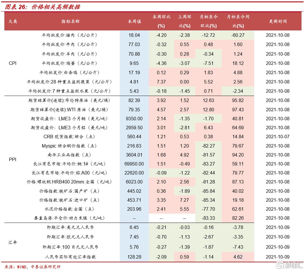 工業品方面,大宗商品價格普遍走強。原油價格繼續走高,布倫特原油期貨結算價錄得82.39美元/桶,較上週上升3.92%,創2018年10月以來新高。WTI原油期貨結算價錄得79.35美元/桶,上升4.57%。國際天然氣和煤炭供給短缺,提振原油需求,油價強勢上漲。LME 3個月銅期貨收盤價上升2.14%,LME 3個月鋁期貨收盤價上升3.01%。CRB現貨指數較上週擡升1.21%。國內方面,Myspic綜合鋼價指數較上週上升1.51%,南華工業品指數環比上升1.68%。本週長江有色市場銅價回彈1.51%。長江有色市場鋁價環比微降0.09%。螺紋鋼價格上升2.10%。鐵礦石方面,進口礦和國產礦環比分別上升0.36%、3.35%。本週水泥價格指數同比漲幅繼續擴大,環比上升2.41%,主要受能耗雙控力度加大、原材料價格大幅提升等因素影響,水泥供給進一步收縮,價格持續上升。