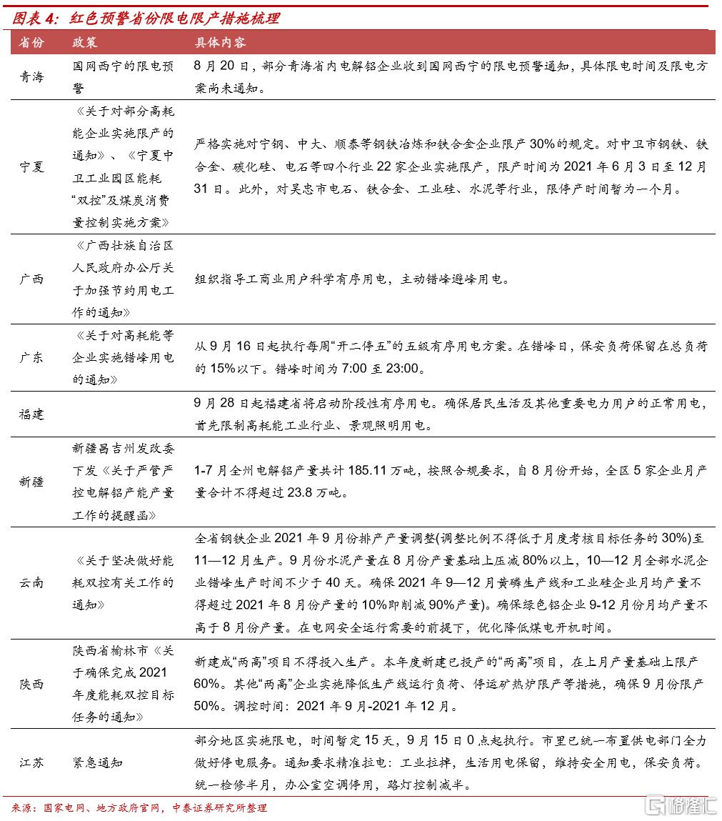 “雙限”背後:主觀調控+客觀約束。討論“雙限”,必須先搞清楚能耗“雙控”(既要降低能耗強度,又要管控能源消費總量)。年初政府工作報告提出全年單位GDP能耗降低3%的要求,但8月份發改委披露的上半年各地區能耗雙控目標完成情況顯示,青海等9省份不降反升,此外浙江等10個省份能耗降低率未達到進度目標。國家發改委9月印發《完善能源消費強度和總量雙控制度方案》,上半年未能達標省份限產限電措施升級,力求完成全年雙控目標。此外,部分地區限電主因“缺煤”導致電能供給不足。如山東、吉林等省雙控進展順利,被迫拉閘限電主因煤炭供需缺口導致供電緊張,疊加今年煤價高企、電廠利潤受到大幅擠壓,供給進一步收縮。