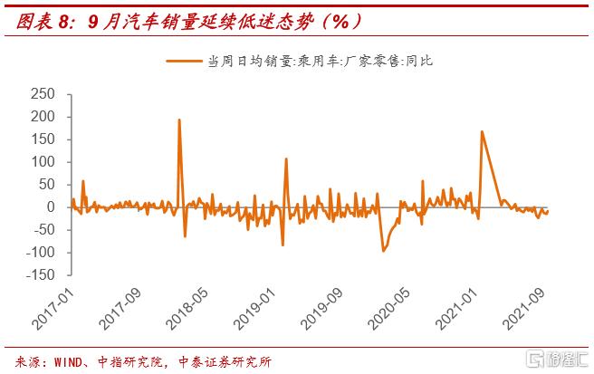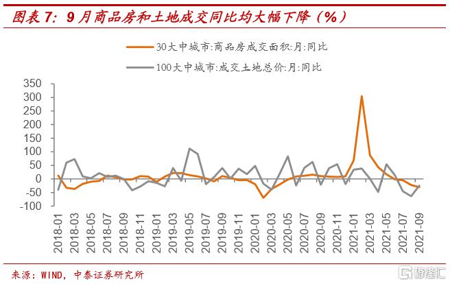 三大投資分項表現分化。1)地產投資延續回落趨勢,竣工邏輯仍有支撐。9月份30大中城市商品房成交面積同比下降30.2%,資金來源增長繼續承壓,同時100大中城市成交土地總價同比下降24.8%,土地購置費對於投資的支撐作用減弱。9月27日央行提出“兩個維護”:維護房地產市場的健康發展,維護住房消費者的合法權益。我們理解有兩方面影響:一是三道紅線、集中度管理等規則不會改變,行業重整趨勢延續,地產投資增速預計延續下滑趨勢;另一方面,考慮到近期部分大型房企風險有所暴露,基於防範系統性金融風險的需要,可能出臺舉措緩釋房企債務處置風險,如保障剛需購房羣體的按揭需求、鼓勵RMBS產品發行等,有助於提高地產投資的韌性。