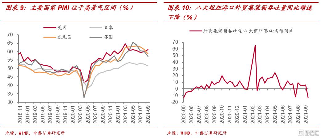 從“外需效應”視角來看,出口短期仍有支撐。9月海外國家製造業景氣度整體維持高位。9月美國ISM製造業PMI上升1.2個百分點,日本、英國、歐元區製造業PMI雖小幅回落但仍位於高景氣區間,顯示海外需求較爲旺盛。運力短缺對出口衝擊預計較爲有限。儘管颱風“燦都”導致寧波舟山港、上海港短期停工,中國貨輪靠港量下降,9月上旬和中旬八大樞紐港口外貿集裝箱吞吐量同比增速5.7%、-13.6%,相比於8月有所回落,但是9月15日起,運力週轉開始逐漸恢復,對出口的負面衝擊預計減弱。