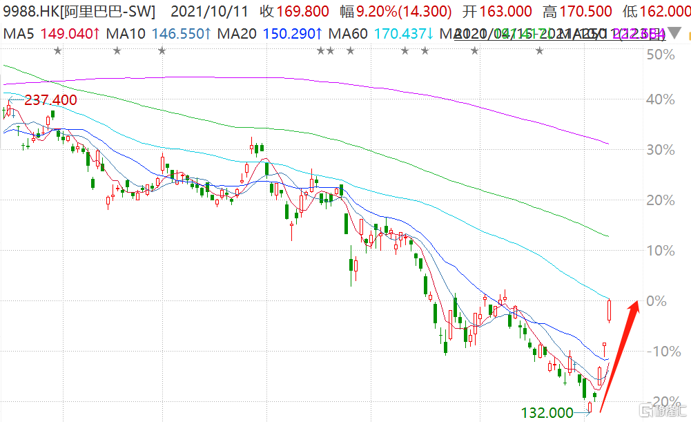 阿里巴巴(9988.HK)漲幅擴大至近10% 4日累漲近30%