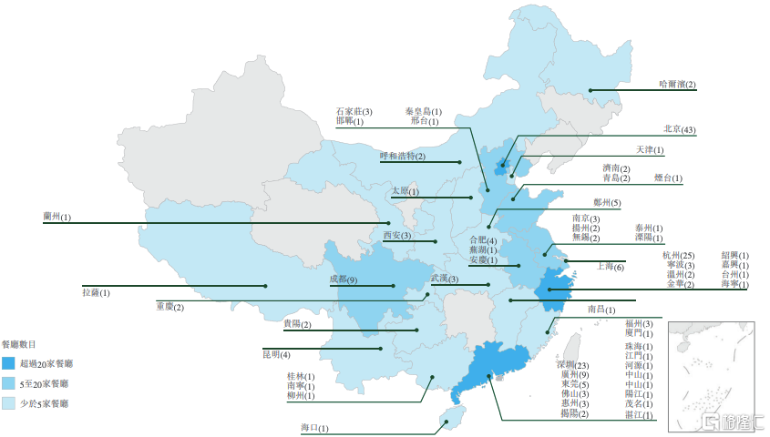 目前綠茶餐廳共覆蓋中國18個省份,四個直轄市,以及三個自治區,主要集中在華東、廣東以及華北區域。