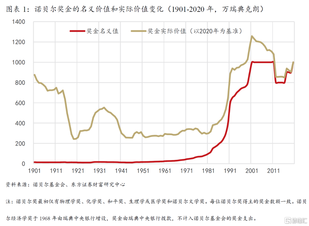 截止10月11日,2021年諾貝爾六大獎項(物理學獎、化學獎、生理學或醫學獎、文學獎、和平獎與經濟學獎)已經全部公佈。從1901年至今,諾貝爾獎已經連續頒發了120年。1901年,諾貝爾基金的初始資產為3,158.72萬瑞典克朗,獎金額為15萬瑞典克朗(相當於2020年的875萬瑞典克朗)。120年後,每項諾貝爾獎的獎金已增長至1000萬瑞典克朗。從名義金額來看,獎金的增長超過60倍。諾貝爾獎的獎金是如何實現這一驚人增長的呢?