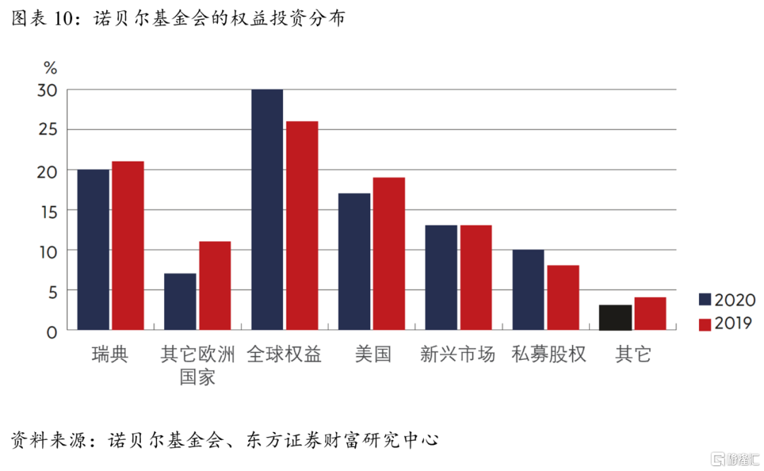 從股票投資的標的選擇上來看,諾貝爾基金會約30%的倉位持有全球權益資產,約20%的倉位投資本地市場瑞典股票。倉位位於第三、第四位的分別是美國市場和新興市場。另外諾貝爾基金會還持有約10%的私募股權。整體來看諾貝爾基金會是一個穩健的全球市場投資者,在全球市場持有股票標的。
