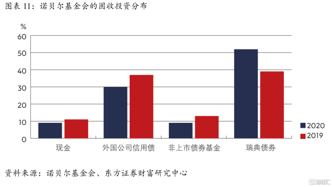 諾貝爾基金會的固收投資和權益投資略有不同,2020年有超過50%的倉位投資於瑞典本土債券,僅有約30%的倉位投資於外國公司信用債。並非像權益投資那樣廣泛參與全球範圍的投資。另外諾貝爾基金會還分別持有約10%的非上市債券基金和現金。2020年諾貝爾基金會固收投資的收益率為1.9%。