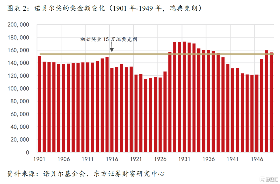 歷史上諾貝爾獎的獎金並非穩定增長。在諾貝爾獎設立後的頭20餘年裏,獎金數額是穩步下降的,直到1928年才超過了最初規定的15萬瑞典克朗。但是受一戰期間大通脹的影響,獎金實際價值反而大幅縮水。僅相當於1901年的52%。