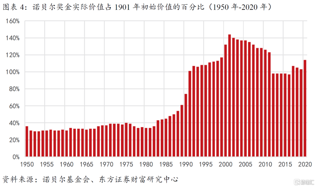諾貝爾基金會在運作時採用“永續年金”的模式,保持本金的價值基本不變,利用投資所得收益支撐獎金的發放。平均來看獎金支出在資產中的佔比約為1.38%。諾貝爾基金會在支付獎金支出及管理費用後,仍能夠實現約1%的資產實際增長。以2020年為例,諾貝爾獎金支出約佔當年總資產的1%,管理費用約佔當年總資產的0.90%。而當年的投資收益率約為6.09%。