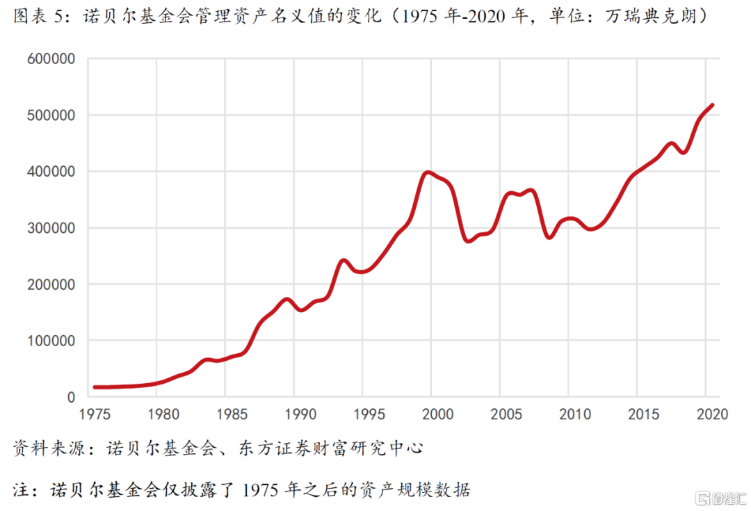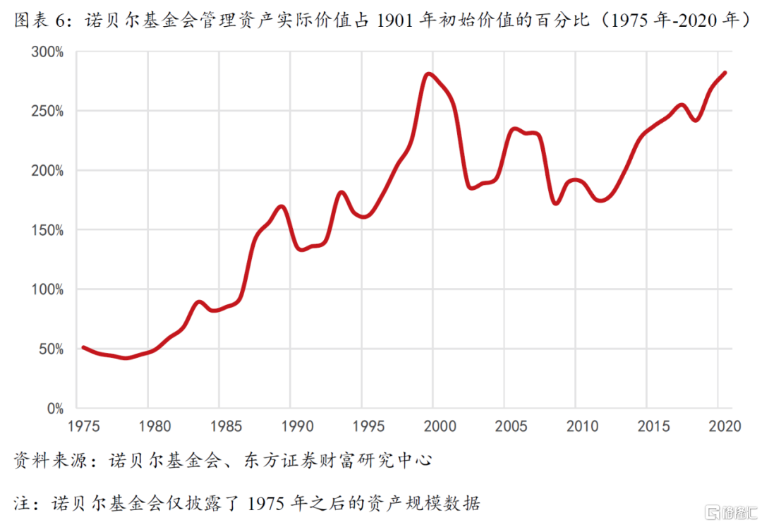 允許投資權益資產,是諾貝爾基金會投資業績改善的重要原因。諾貝爾基金會的投資風格大致可以分為兩個階段,第一個階段是20世紀初至20世紀40年代。在這一階段基金會僅能投資“安全證券”,主要是金邊債券,或者抵押物為金邊債券或房地產抵押貸款的貸款。這使得基金收益難以跑贏通脹。第二個階段是20世紀50年代至今,為了解決投資收益跑輸通脹的問題,在基金會董事會的爭取下,瑞典政府在20世紀50年代批准了改革方案。管理人被賦予充分的自由,不僅可以投資房地產、債券和抵押貸款,還可以投資大多數類型的股票。這使得基金會得以改善投資組合以對抗不斷上升的通貨膨脹。